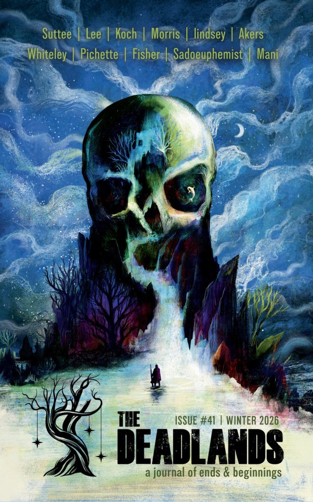 The Deadlands is a quarterly speculative fiction magazine. We publish short stories, poems, and essays about the other realms, of the ends we face here, and the beginnings we find elsewhere. It is an adventure into the unknown, to meet those who live there still, even though they may be dead. Death is a journey we all will take, but we’d like to peek at the map before we go.