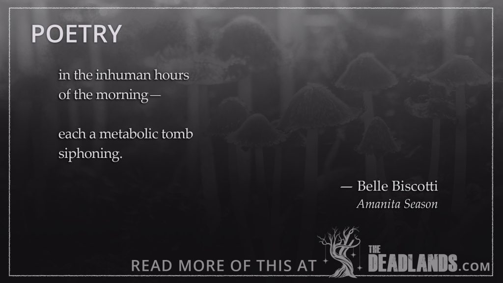 Beneath the necrotic oakthe Death Caps flourish their flesh-umbrellaed skulls in the inhuman hoursof the morning— each a metabolic tombsiphoning. […]