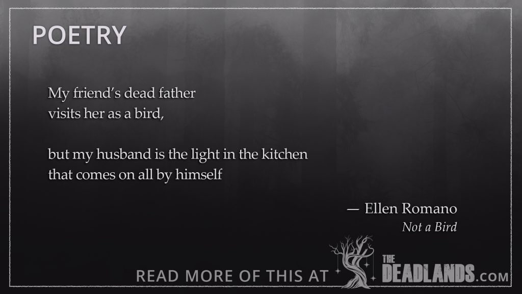 Not a Bird Ellen Romano My friend’s dead fathervisits her as a bird, but my husband is the light in the kitchenthat comes on all […]