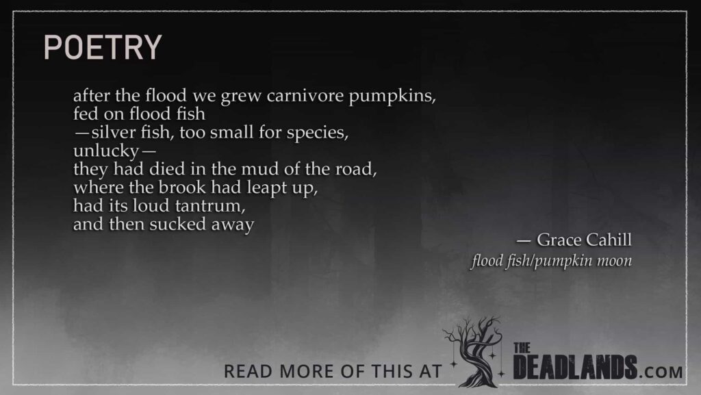 after the flood we grew carnivore pumpkins,fed on flood fish—silver fish, too small for species,unlucky—they had died in the mud […]