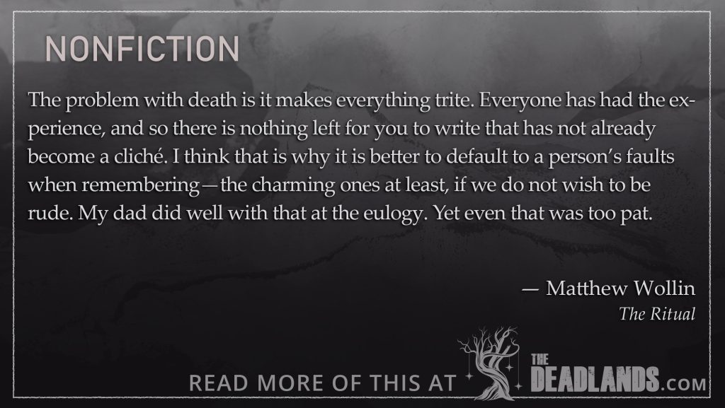 The Ritual Matthew Wollin The red earth from my grandmother’s graveyard stained my white sneakers. I wiped it off later, with a damp paper […]