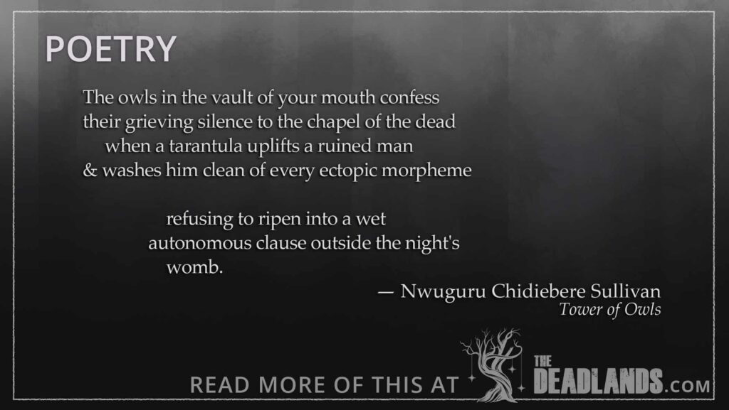 The owls in the vault of your mouth confess their grieving silence to the chapel of the dead when a tarantula uplifts a