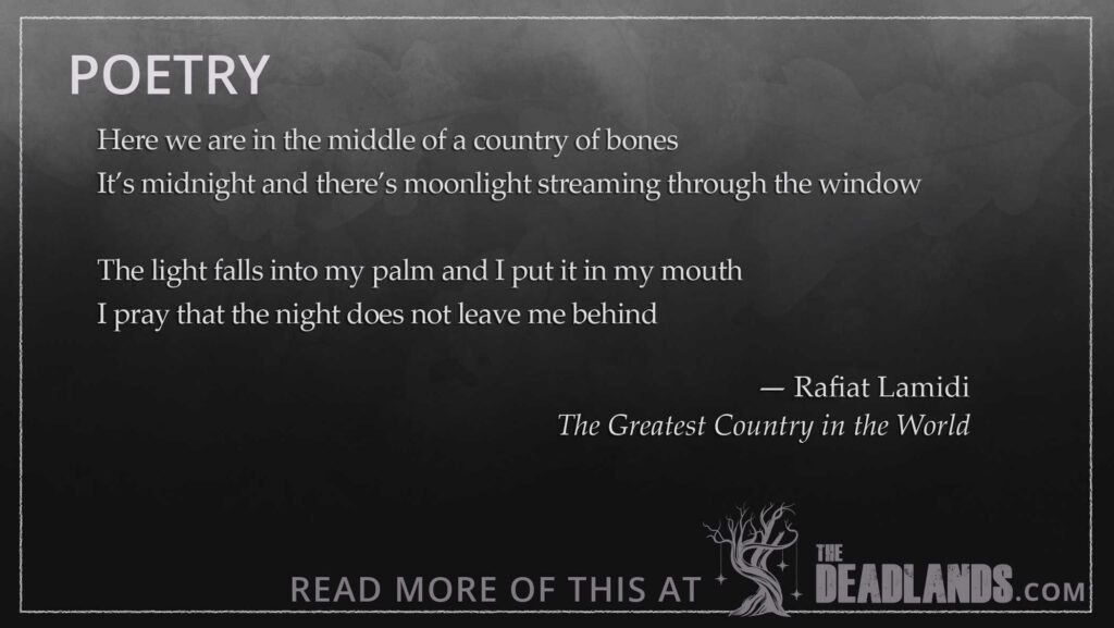 Here we are in the middle of a country of bonesIt’s midnight and there’s moonlight streaming through the window The […]